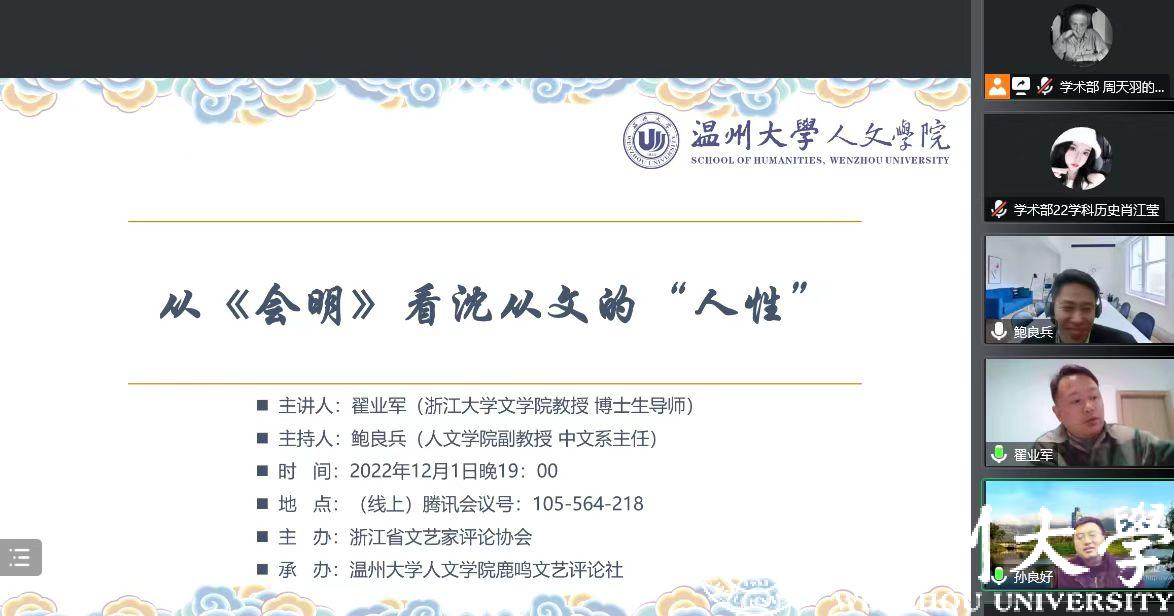 2022年12月1日19点,浙江大学文学院教授、博士生导师翟业军老师受邀为全讯白菜网官网师生带来了一场题为“从《会明》看沈从文的‘人性’”的精彩讲座。讲座由鲍良兵老师主持。