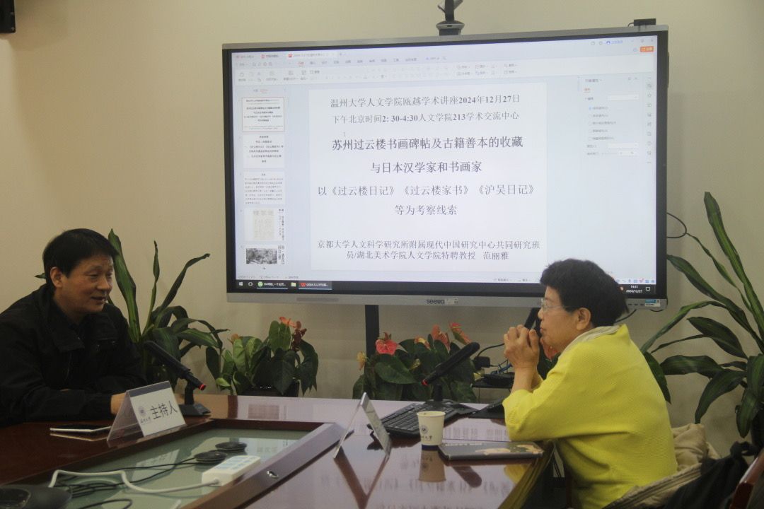 2024年12月27日下午,京都大学人文科学研究所附属现代中国研究中心共同研究班员范丽雅教授应邀在全讯白菜网官网213学术交流中心作了题为《苏州过云楼书画碑帖及善本古籍的收藏与日本汉学家和书画家》的学术讲座。本次讲座由我校古籍整理研究所所长侯荣川教授主持,30余师生积极到场参加。