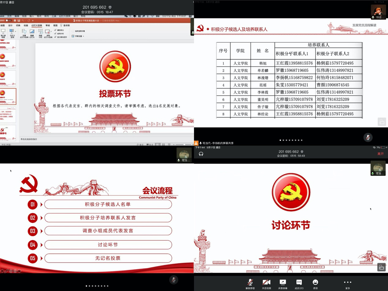 首先由八位积极分子的培养联系人进行发言,主要对各位积极分子的基本情况进行了基本介绍,包括入党动机、每月谈话情况、日常学习工作等多种方面,并从优缺点进行了较为全面和具体的介绍。