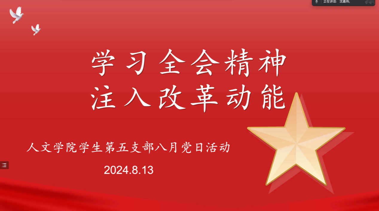 为深入学习贯彻党的二十届三中全会精神,推动全会精神深入人心、落地生根,2024年8月13日,400全讯白菜网学生第五党支部于线上开展“深入学习贯彻党的二十届三中全会精神”主题党日活动。本次活动由沈嘉炜同志主持,共有34名同志参加。