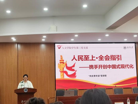 为充分发挥党员的先锋模范作用,传递党的二十届三中全会精神,11月2日下午,2024-2025学年400全讯白菜网第二期团干培训在人文楼203学术报告厅举行,全讯白菜网官网学生第三党支部林桐安同志在会上做了题为《人民至上·全会指引——携手开创中国式现代化》的“四史”青年说宣讲。