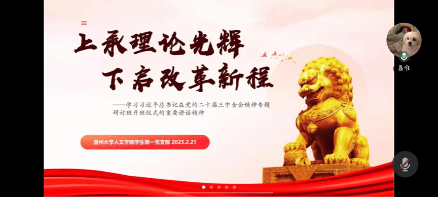 2025年2月21日晚上,400全讯白菜网学生第一党支部举办了“上承理论光辉,下启改革新程”主题党日活动,通过学习习近平总书记在党的二十届三中全会精神专题研讨班开班仪式的重要讲话精神,不断深化对新时代全面深化改革的认识,进一步统一思想和行动。本次活动由聂唯同志主持,支部全体党员同志参加。