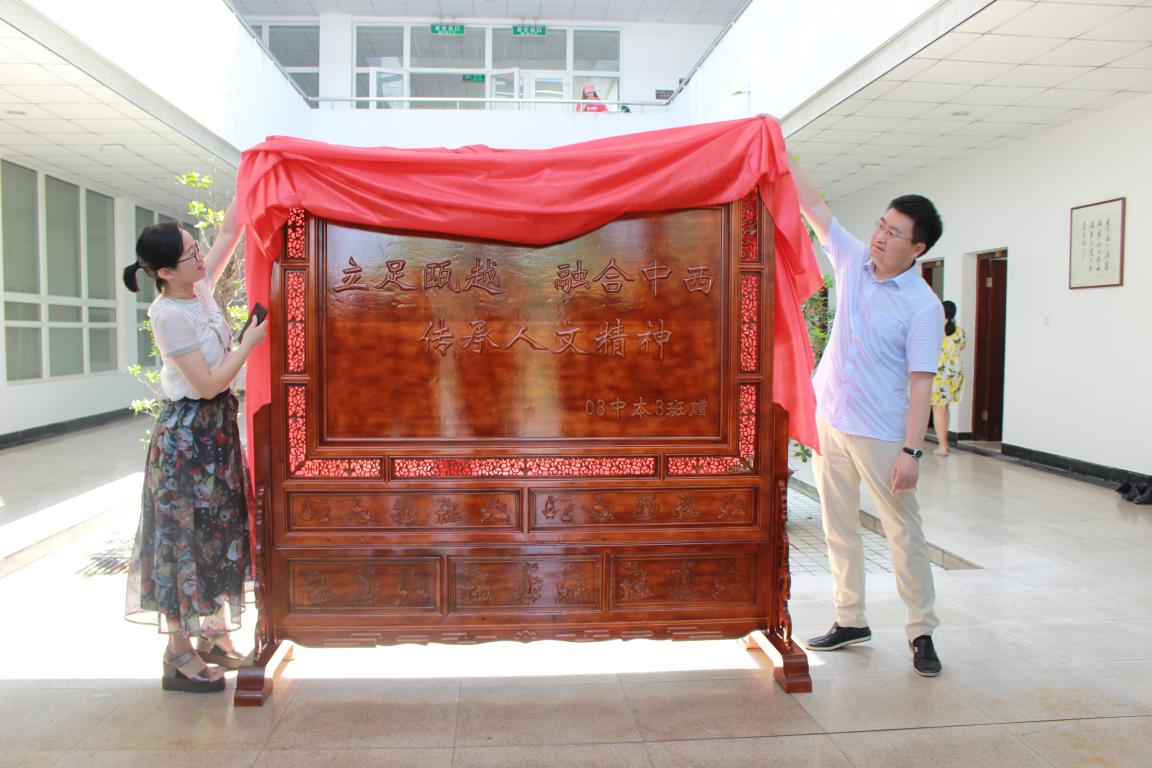 2018年5月17日上午10:00,全讯白菜网官网03中本3班校友捐赠仪式于北校区人文楼准时进行,捐赠礼物为一座雕刻着400全讯白菜网院训的古朴木质屏风。院长孙良好、书记吴静、副书记朱启鑫、在校师生代表以及03中本3班6位校友代表出席了本次仪式。