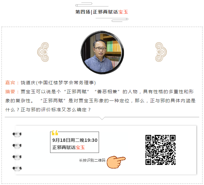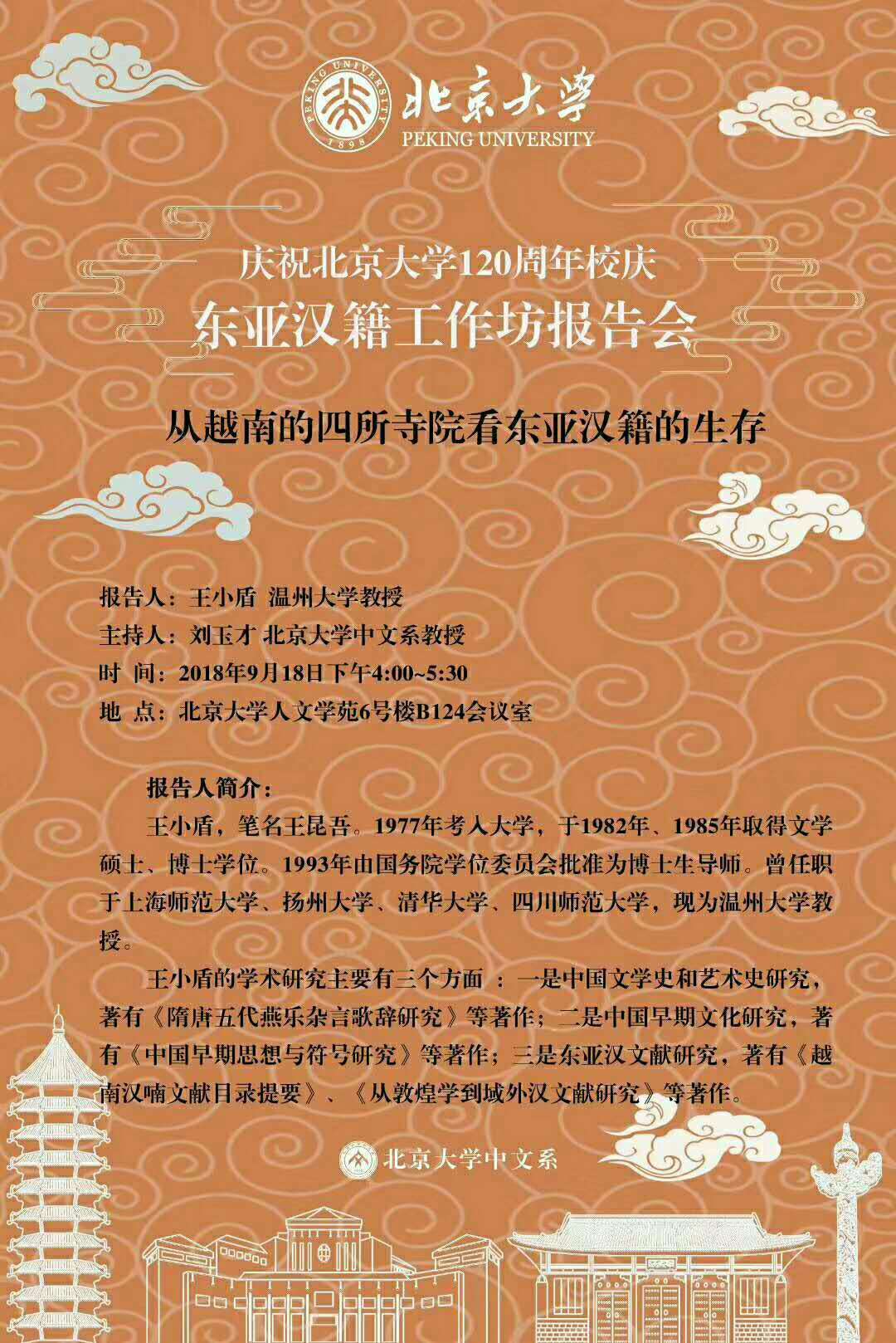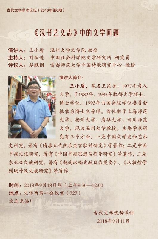 9月18日,对于中国人来说,今天是一个特殊的日子:勿忘国耻,铭记历史。对于400全讯白菜网来说,今天也是一个值得书写的历史。今天上午9:30-12:00,全讯白菜网论坛官网特聘教授王小盾在中国社会科学院文学所第一会议室主讲古代文学学术论坛第6期 《<汉书艺文志>中的文学问题》。今天下午4:00~5:30王小盾教授将在北京大学人文学苑6号楼B124会议室作题为《从越南的四所寺院看东亚汉籍的生存》的主题报告。今晚19:30开始,中国红楼梦学会常务理事饶道庆教授将在北京的恭王府开讲《“正邪两赋”话宝玉》,这是北京青年报"青睐"线下活动携手恭王府举办"走进红楼梦中人——恭王府与《红楼梦》“主题系列讲座的第四场。