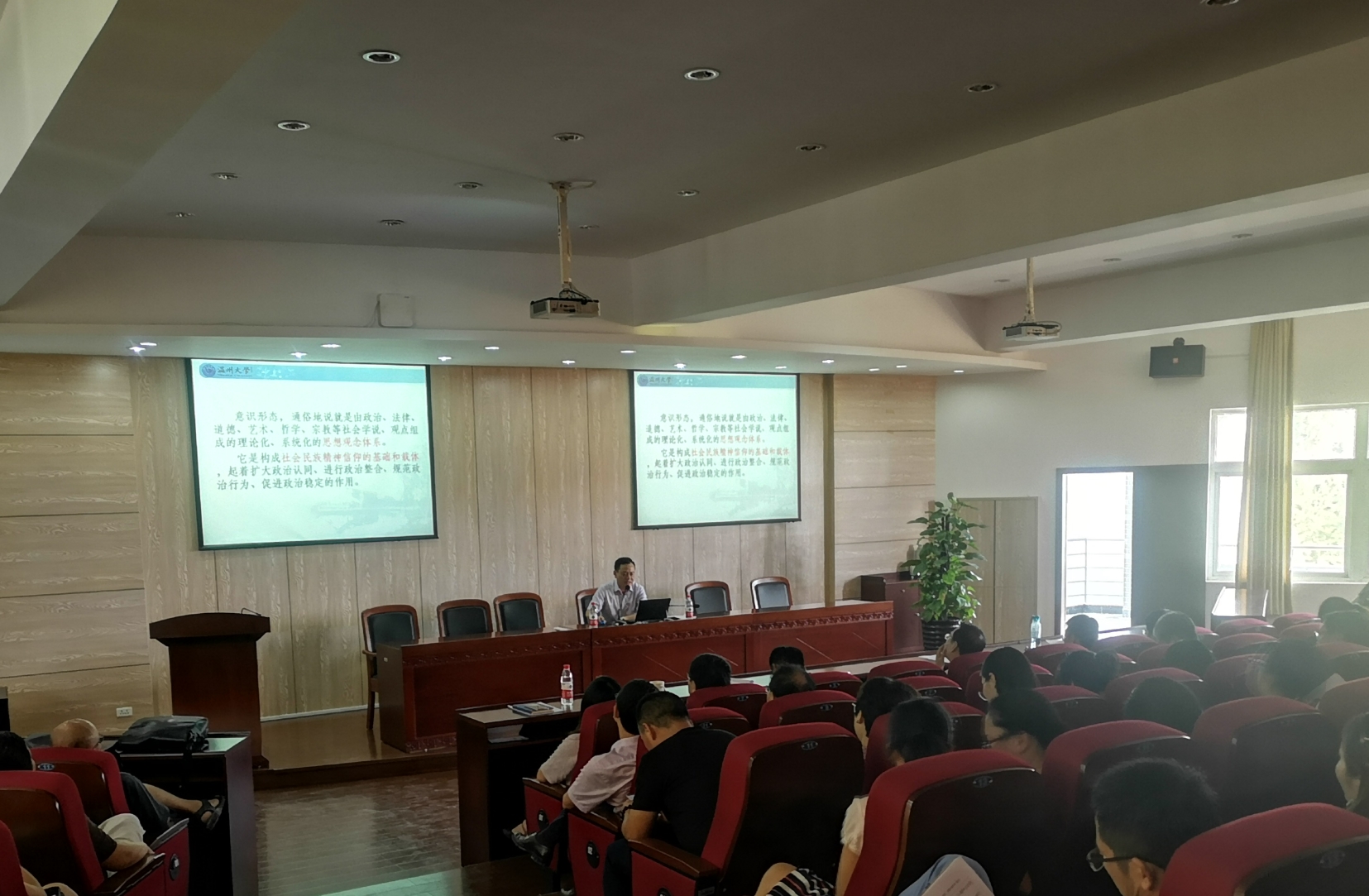 潘部长的讲座围绕“什么是意识形态工作?”“为什么要加强意识形态工作?”“怎么样加强意识形态工作?”三个问题展开。他认为一直以来高度重视、善于做好意识形态工作,是我们党的政治优势和优良传统,是我们党凝聚力量、鼓舞士气、战胜困难、走向胜利的“第二大武器”。目前从国内形势看,意识形态工作中历史虚无主义大行其道,网络舆论对意识形态话语权构成挑战,国人理想信念有所弱化,价值观的建设任重道远。而反观国外,西方意识形态势力从未停止渗透。