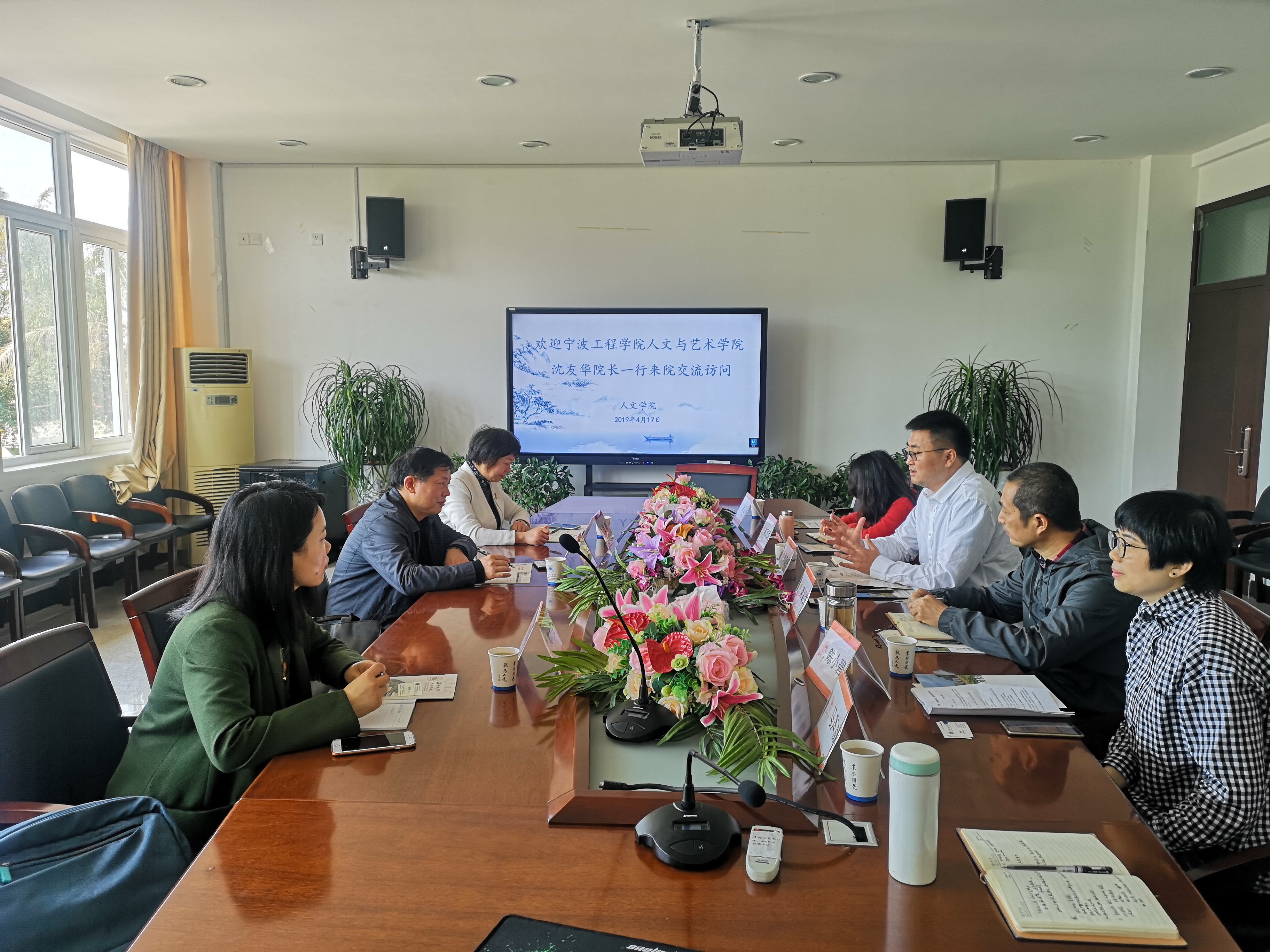 4月17日上午,宁波工程学院人文与艺术学院院长沈友华,副院长吕瑾及中文系副教授陈小亮来全讯白菜网官网交流访问。全讯白菜网官网孙良好院长、席留生副院长、中文系主任陈源源、广告系主任徐卫华、大学语文负责人陈小碧和办公室主任马声威热情接待了他们。双方就应用型学科专业建设、公共课程大学语文教学情况、专业硕士人才培养等方面进行了深入交流。