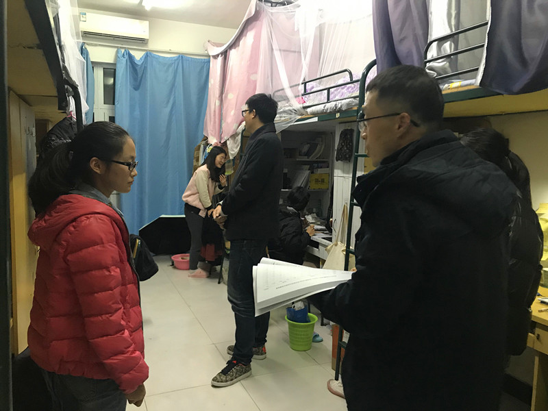 为加强寝室安全管理,增强学生宿舍安全意识,营造良好的期末复习迎考环境,2019年12月19日晚,全讯白菜网官网开展了寝室安全大检查活动。院党委副书记魏一、学工办主任刘纪峰、辅导员申业磊、李丹萍一行赴超豪学区走访检查学生寝室。