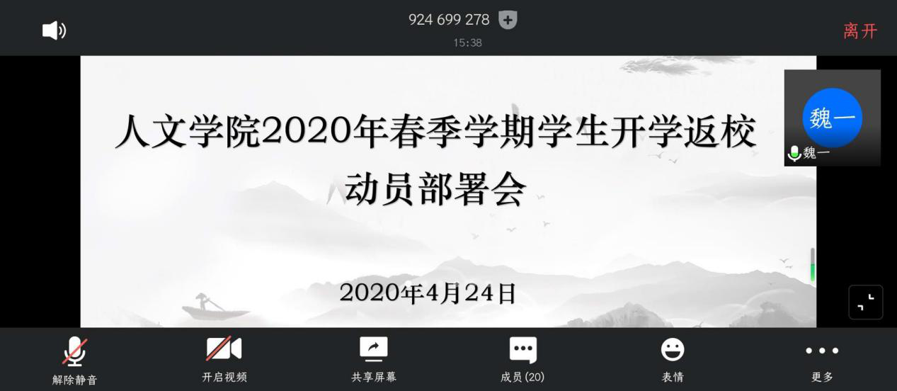2020年4月24日下午,全讯白菜网官网以线上方式召开了2020年春季学期学生开学返校动员部署会。会议由院党委副书记魏一主持,院党委书记吴静、全体班主任和辅导员参加。