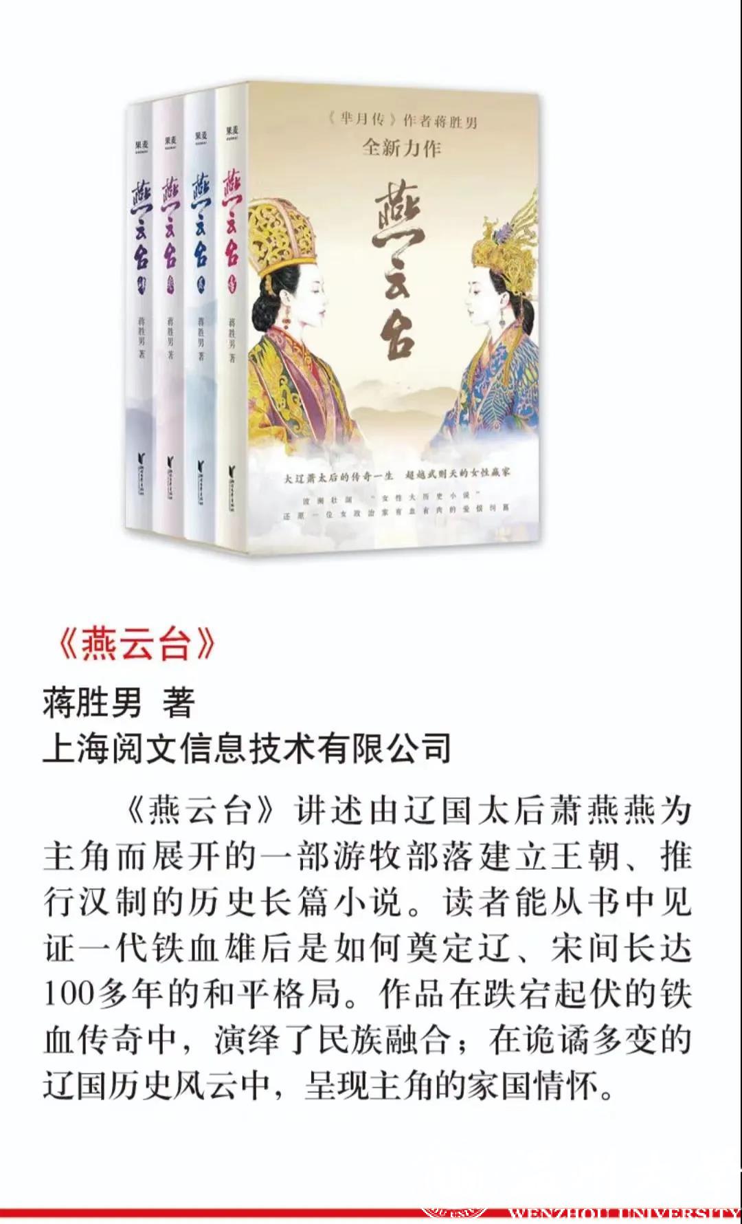 4月23日,在“2019年度中国好书”的评选中,由我校400全讯白菜网蒋胜男研究员所著、浙江文艺出版社出版的《燕云台》荣膺网络文学类“2019年度中国好书”荣誉。