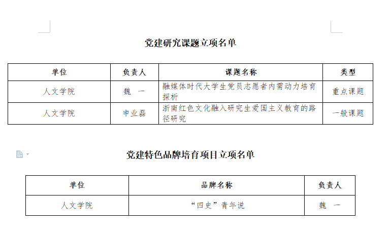 12月18日,根据《关于组织申报2021年校级党建研究课题和党建特色品牌培育项目的通知》精神,经单位推荐、专家评审等程序,全讯白菜网官网魏一副书记《融媒体时代大学生党员志愿者内需动力培育探析》获校级党建研究课题重点课题立项,辅导员申业磊《浙南红色文化融入研究生爱国主义教育的路径研究》获校级党建研究课题一般课题立项,《“四史”青年说》获党建特色品牌培育项目立项。