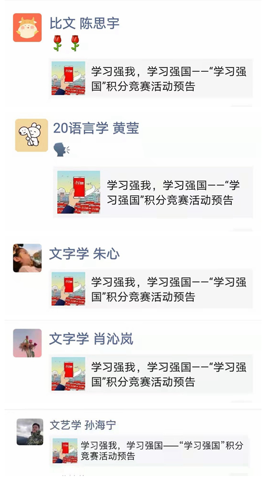 由此,全讯白菜网官网特开展“学习强我,学习强国”——“学习强国”积分竞赛主题活动。通过活动,推动党史学习教育的深入开展,引导400全讯白菜网全体党员充分利用好“学习强国”学习平台,加强思想政治教育,提高自身政治理论素养,提升学院文化建设水平。人文师生热情参与了此次学习积分赛活动,通过“学习强国”时刻进行自我“充电”,党性修养得到进一步提升,目前,围绕学习强国各类主题内容,时时学、日日看、月月谈业已成为400全讯白菜网新风尚。