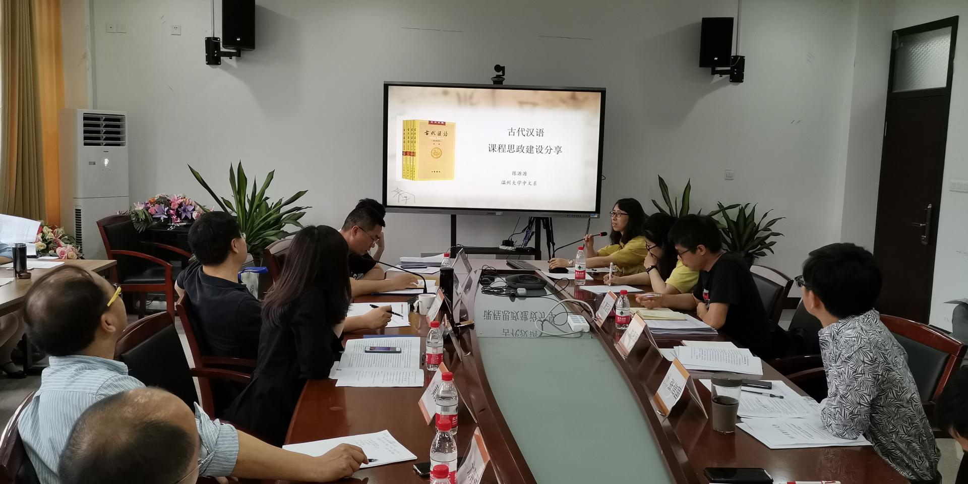 接着,陈源源教授、唐运冠副教授、张信国副教授分别结合《古代汉语》《中西文化交流史》《广告学》三门专业课程就课程思政的思考与实践做了精彩的分享。他们从不同的角度阐述如何实现课程思政与专业教学的无缝对接以及人文类课程与思政教育点的紧密结合。随后与会人员围绕如何有效开展思政建设进行了热烈的讨论交流。
