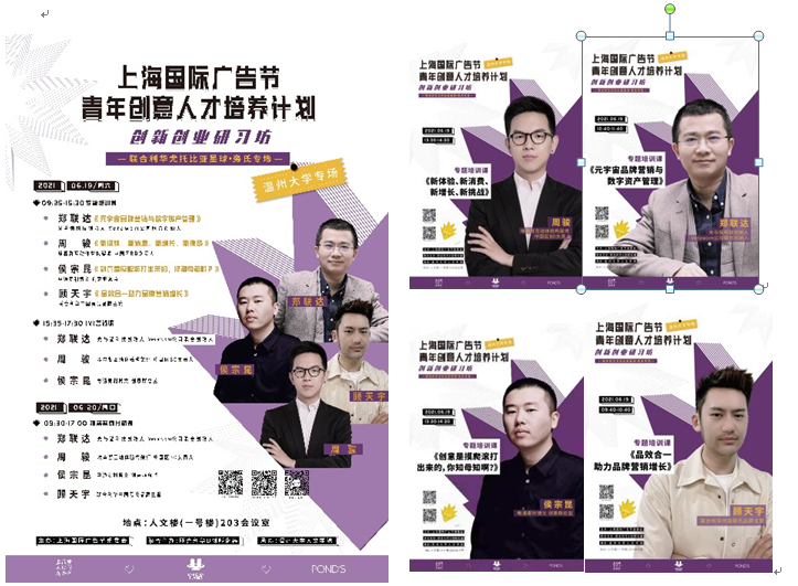 经广告系全体老师共同努力和精心筹备,6月19、20日,一场来自大上海的广告创意头脑风暴,将席卷400全讯白菜网。上海国际广告节把它的拳头公益品牌活动——青年创意人才培养计划创新创业研习坊搬进温大,来自上海国际广告节战略合作方——联合利华旁氏品牌、电通麦利博文、埃森哲互动与光弧科技的业界精英们将为温大广告学子带来精彩纷呈的创新创意创业的饕餮盛宴!