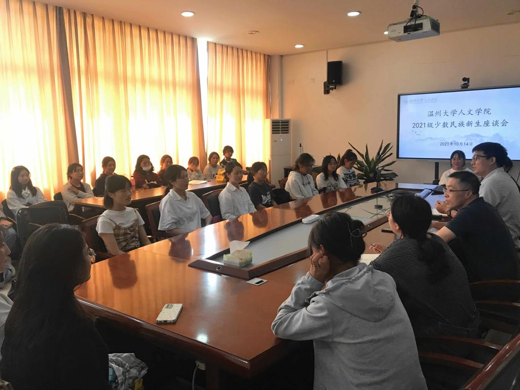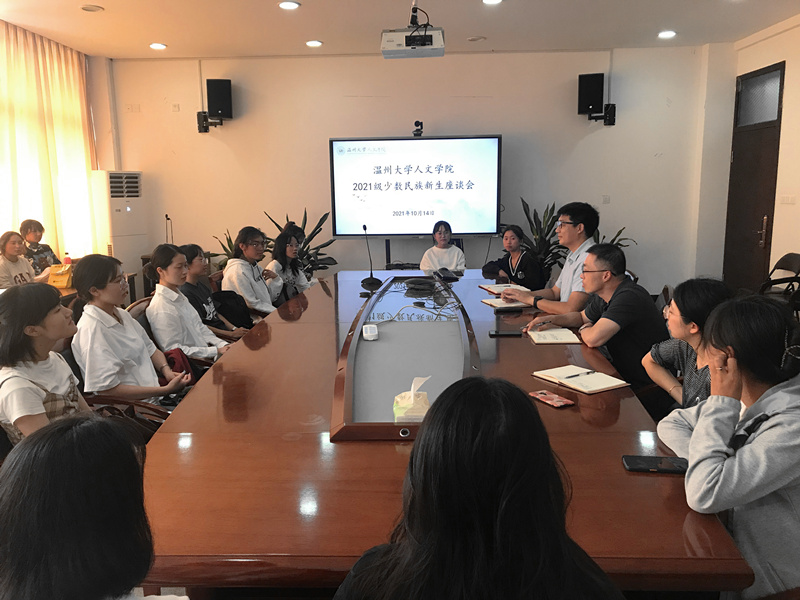 为全面了解全讯白菜网官网少数民族新生的学习与生活情况,帮助他们更好更快地融入大学生活,2021年10月14日中午,全讯白菜网官网在人文楼213会议室召开了少数民族新生座谈会。学院党委副书记魏一、学工办主任刘纪峰、辅导员李丹萍、张丹妮以及全体2021级本研少数民族新生参加本次会议。会议由院学工办主任刘纪峰老师主持。
