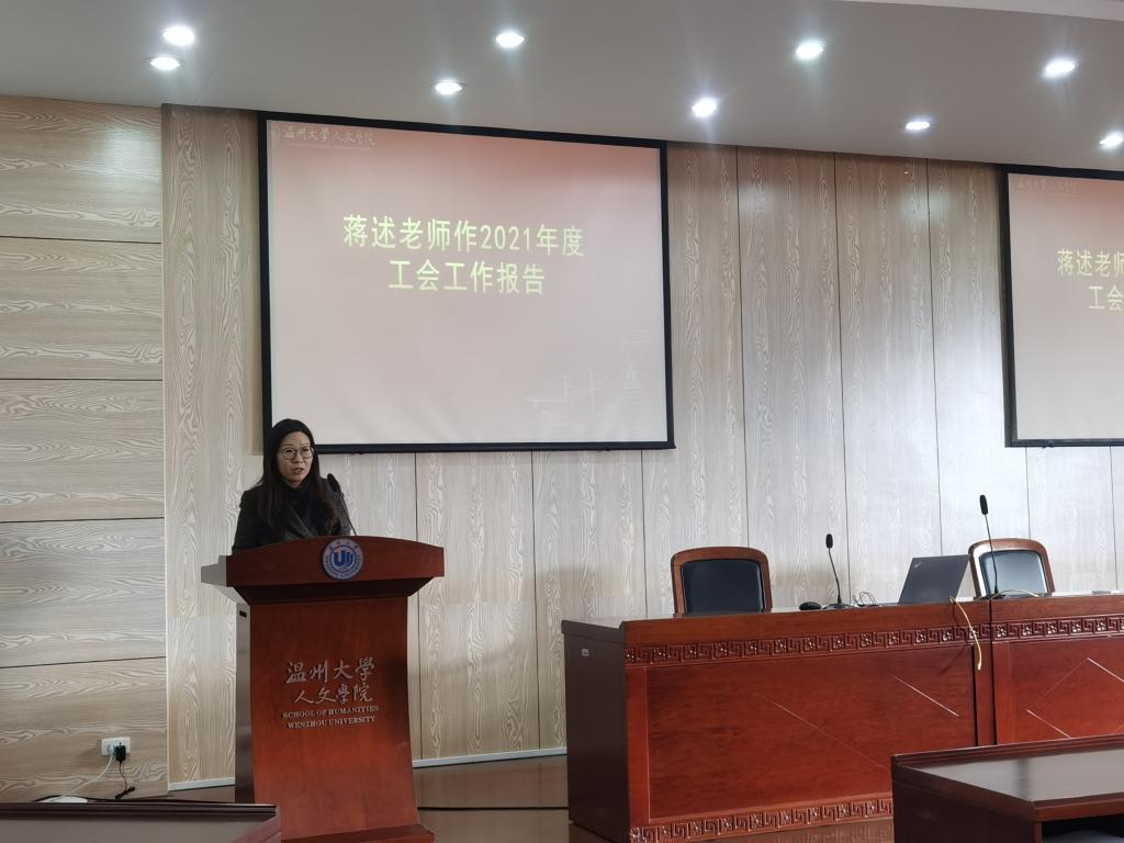 学院工会主席蒋述老师作《400全讯白菜网2021年度工会工作报告》,报告全面回顾了400全讯白菜网第五届工会在过去的一年里全面履行各类工会职责,较好地完成了工会的各项工作任务,并对学院工会经费使用作了说明。同时对学院全体老师对工会工作的配合和支持予以衷心的感谢。