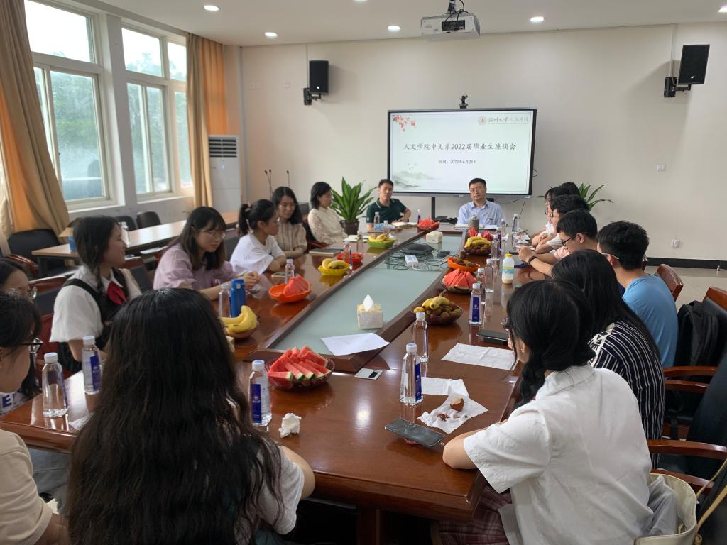2022年6月21日中午,中文系在人文楼213举行了中文系2022届本科毕业生座谈会。15位毕业生应邀出席座谈会,学院孙良好院长、中文系主任鲍良兵、副主任余琼和李广旭参加了座谈。