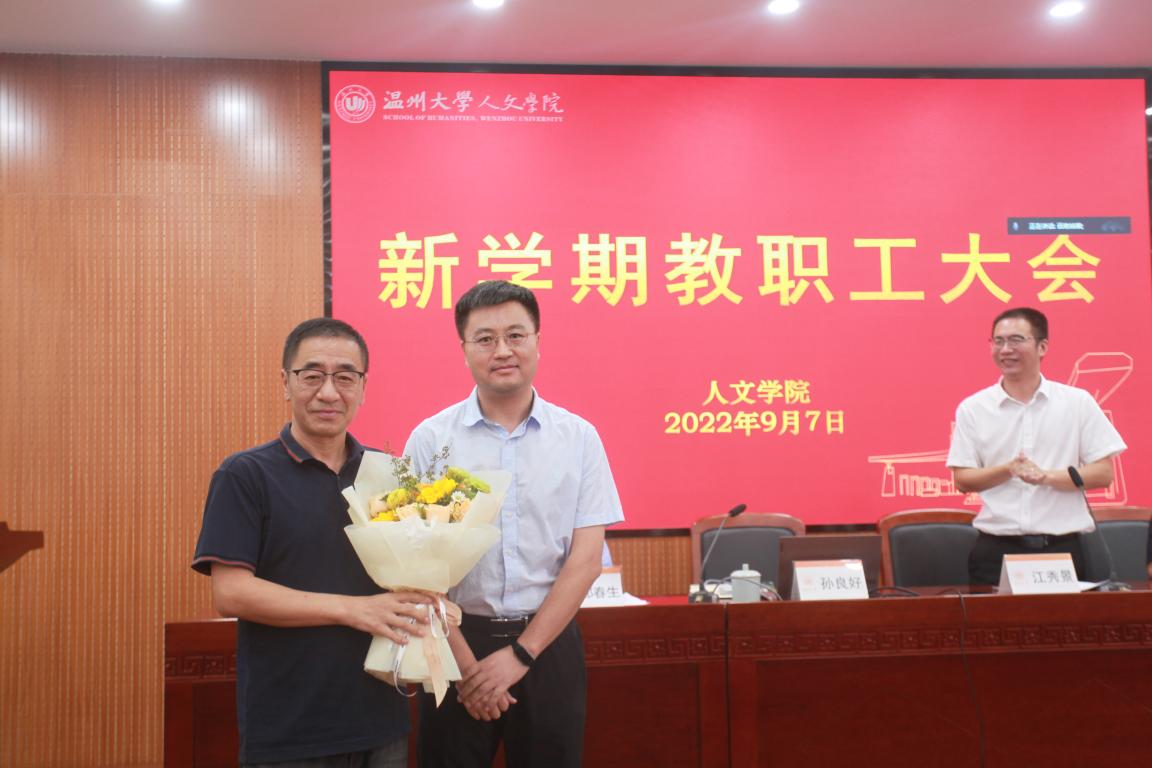 会议首先举行了教师荣退仪式。院长孙良好为上半年退休的魏成春老师送上鲜花与纪念品,表达了学院的美好祝福。退休教师魏成春对学院举办的欢送活动表示感谢,对学院未来的发展充满期待,表示会一直关注并支持学院的发展。
