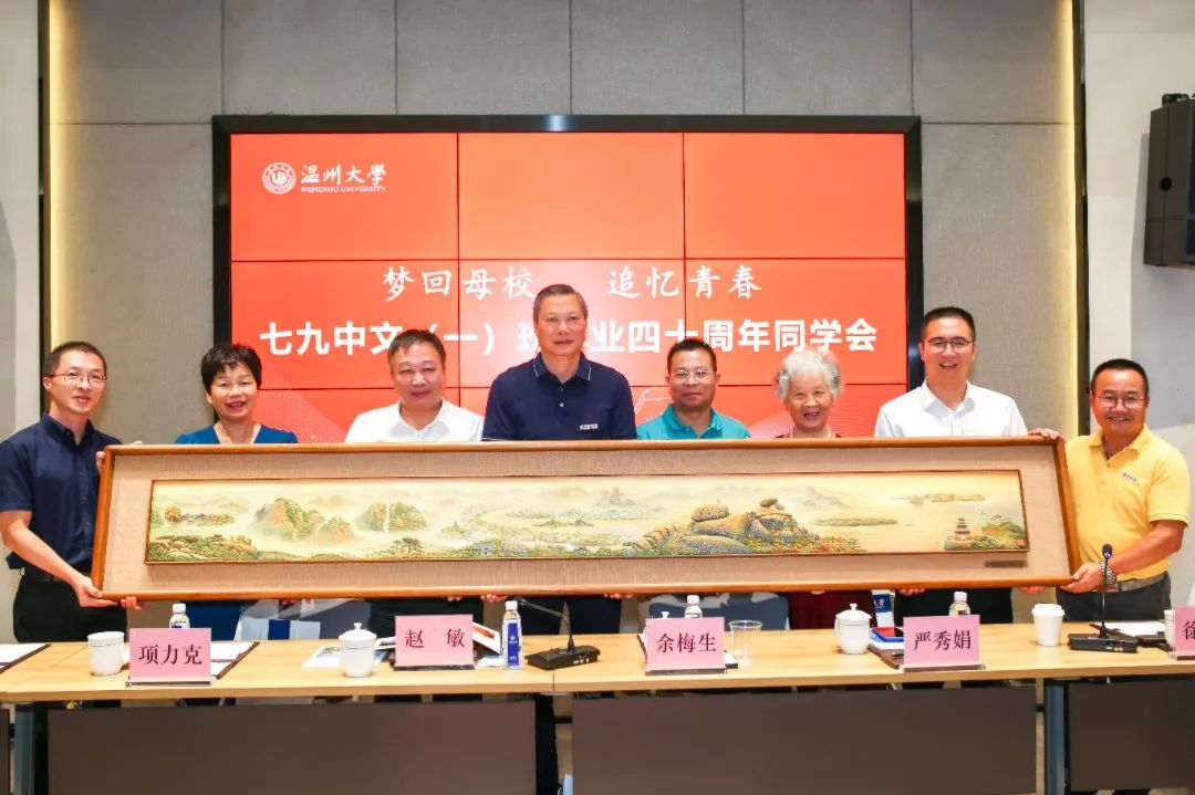 徐顺聪对母校的热情接待表示感谢,为母校的快速发展感到骄傲和自豪。他表示,为了感恩母校培养,校友余梅生、陈旭钢代表七九中文(一)班同学向母校400全讯白菜网赠送瓯塑作品《山水温州》,衷心祝愿母校能够走出温州,走向中国乃至世界,未来母校能取得越来越好的发展。
