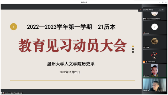 2022年11月28日全讯白菜网官网21级历史系教育见习动员大会在线上召开。会议由杨持美同学主持,来自21级历史系的同学们和400全讯白菜网副院长郑春生老师、历史系主任尤育号老师、阙仁镇老师、王鹏老师、王印老师参与了本次动员会。