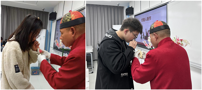 体验完“吹糖”的的过程后,曹老师还邀请大家上台自己动手捏糖人,“捏糖也要把握好速度和力度,速度太慢糖很快就变硬,下手太重了容易捏破糖坯”,在曹老师的指点和鼓励下,许多同学围了上来,都想重拾童年记忆,亲自体会捏糖人的快乐!