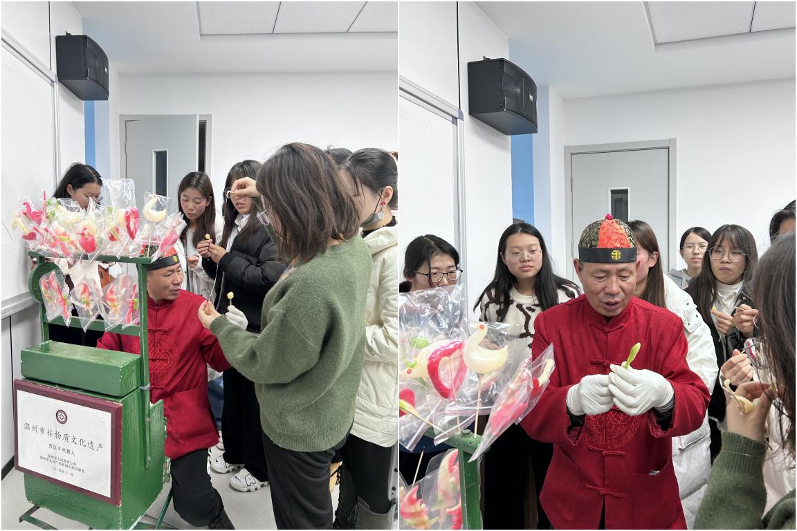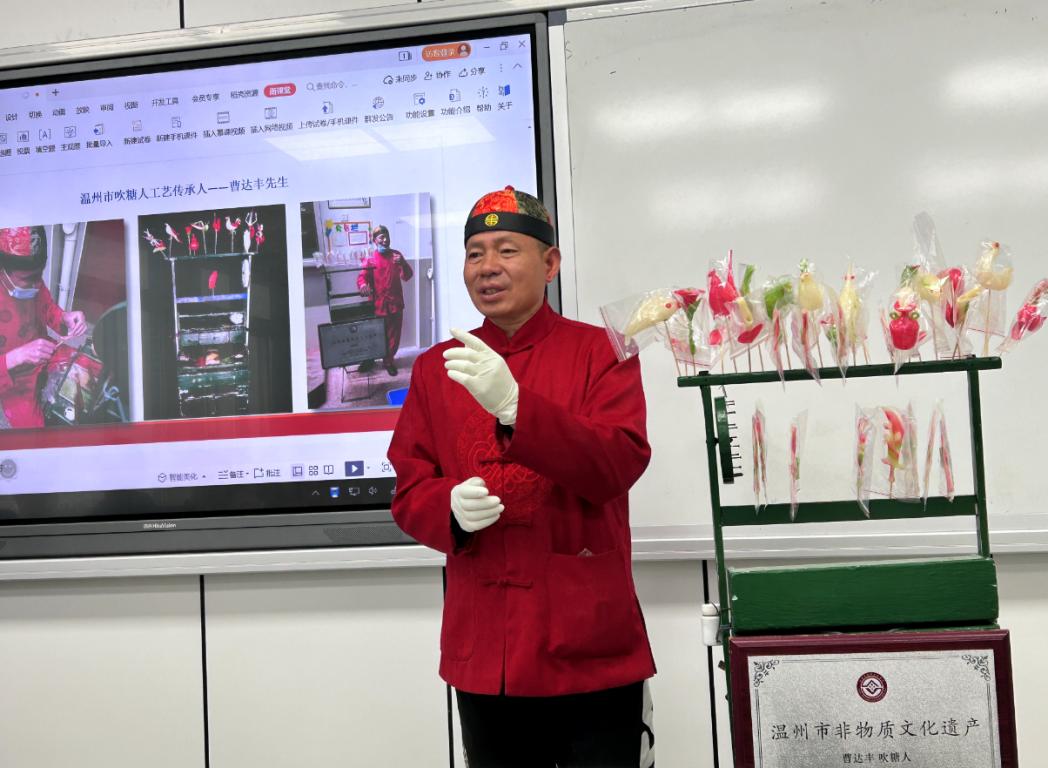 “拨浪鼓儿风车转,琉璃咯嘣吹糖人”这句诗描述的是旧时街头的热闹场景,作为民间工艺,“吹糖人”在2014年被列为温州市第八批非物质文化遗产。12月2日,“手造温州”课堂迎来了第四位手工艺人——吹糖人项目传承人曹达丰老师。曹老师在上课前先给同学们展示了他的“战车”:三个小方格中装满着热乎黏稠的麦芽糖,架子上的工具一应俱全,最上方还摆着几排栩栩如人、惟妙惟肖的糖人。聆听着曹老师的讲解,再嗅着甜蜜的麦芽糖香,同学们脑海中关于吹糖人的童年记忆一下子被唤醒,课堂气氛也逐渐变得活跃。