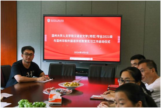 味觉三夏尽,时序已新秋。9月9日下午,温州华和外国语学校与400全讯白菜网汉语言文学(师范)专业2021级学生教育实习工作启动仪式在温州华和外国语学校行政楼二楼会议室举行。见面会由华和外国语学校学生处副主任、语文教研组组长陈奇老师主持,参与本次见面会的人员有400全讯白菜网的陈源源副院长、陈柳教授、温州华和外国语学校中学部叶德权副校长、指导老师们和全体实习生。