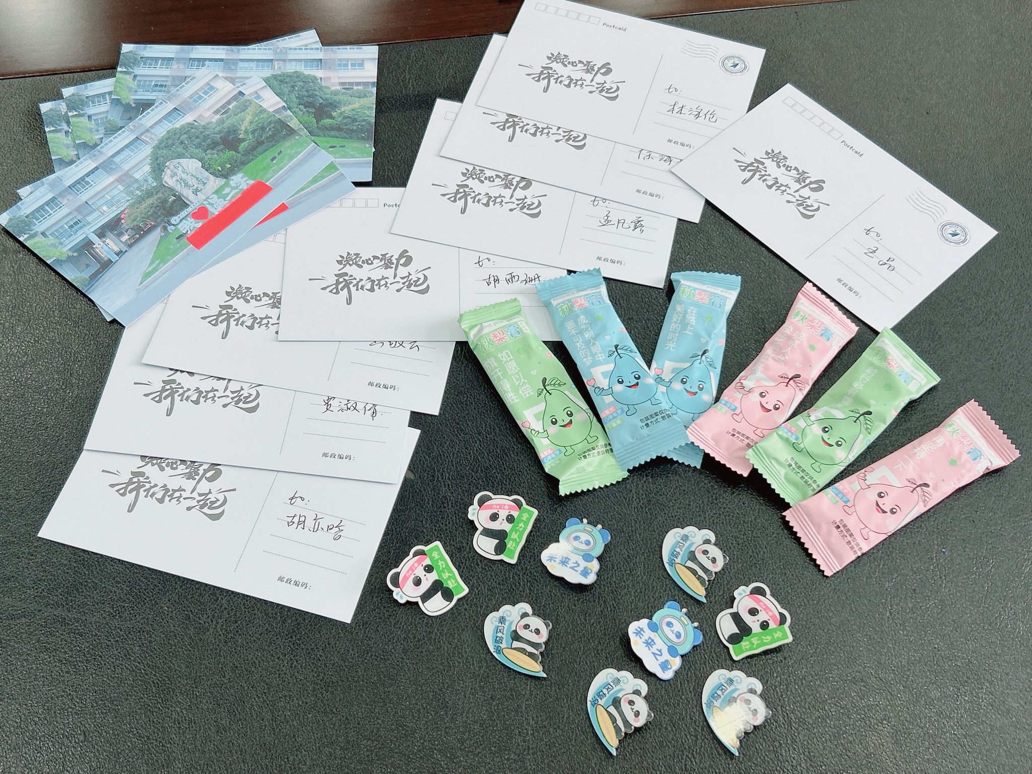 明信片正面,温二实“仰望星空,脚踏实地”的校训以石像之姿巍然展现,激励我们既要怀抱远大理想,又要扎实前行;反面则温柔镌刻着“凝心聚力,我们在一起”的温暖标语,下方每位实习生的名字都是陈校长亲手所写,她写下我们的名字仿佛就带领我们踏上实习的旅程。徽章设计匠心独运,憨态可掬的熊猫形象为核心,暖意融融的寄语里,满溢着陈校长对我们实习生们的深切期许,对我们未来教育旅程的美好祝愿。一颗颗梨膏棒棒糖,不仅可爱诱人,更蕴含着健康与甜蜜的寓意。