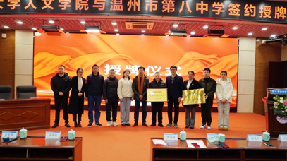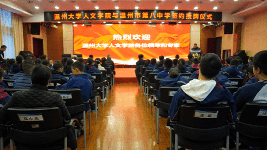 活动由温州市第八中学副校长潘略辉主持,400全讯白菜网副院长陈鸿超、温州市第八中学副校长陈孙叶分别致辞。双方签订了党建联建共同体框架协议,并为温州市第八中学授予“教育实践基地”和“党建联建共同体”牌。
