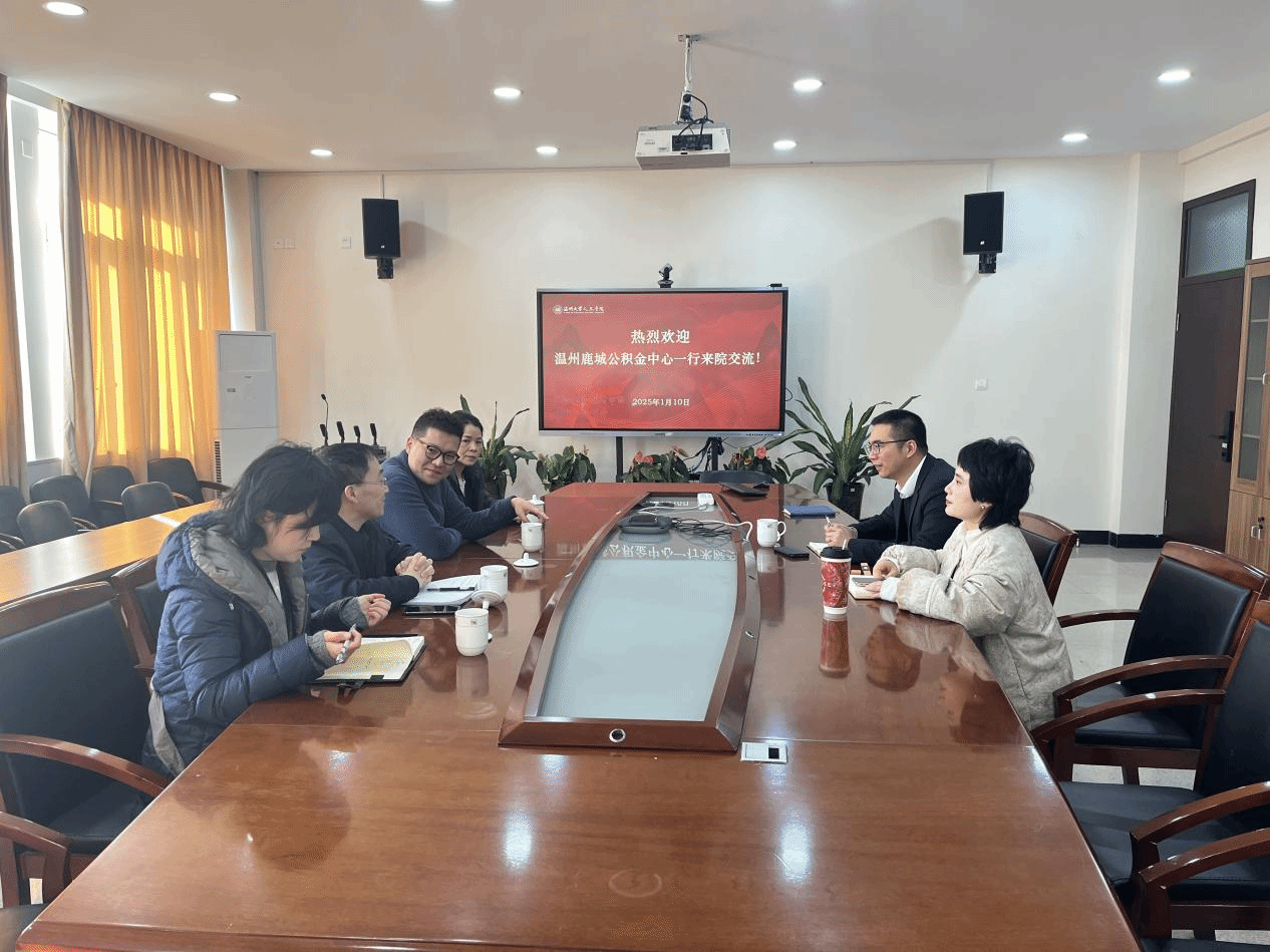2025年1月10日下午,温州市鹿城公积金中心郑风华、陈炯奇、杨洁晓等一行来访全讯白菜网官网,在人文楼213会议室开展交流,学院党委书记江秀景、院党委副书记黄玮热情接待。