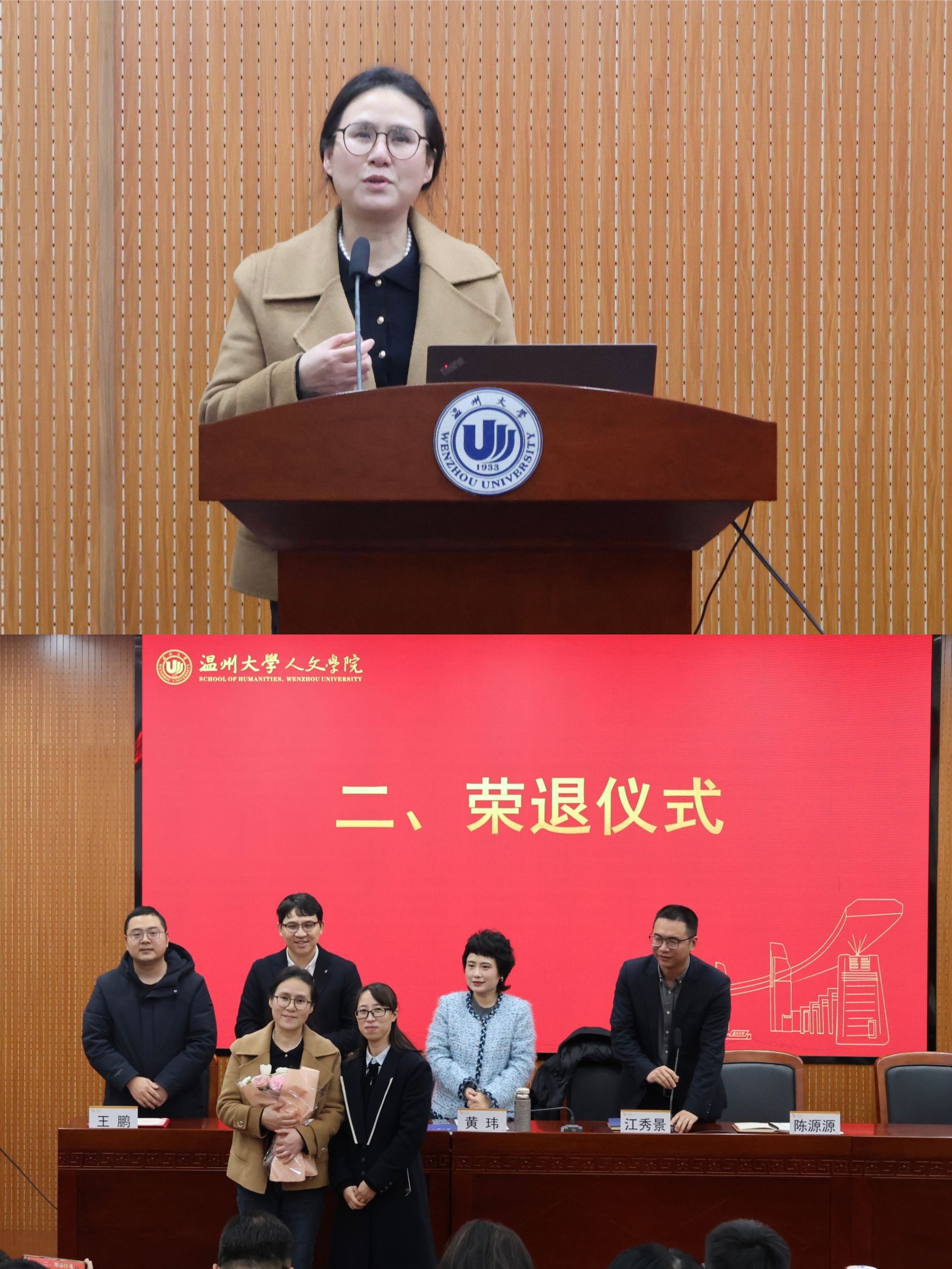 “离岗不离心,退休不褪色。”会议举行荣休仪式,陈婷婷老师发表荣休感言,回顾多年“平凡”又不凡的工作历程,诉说对教育事业的热爱与不舍。陈源源副院长送上鲜花与纪念品,表达学院对荣休教师的崇高敬意与美好祝福。