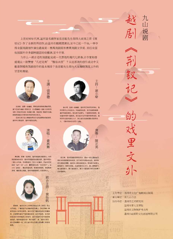 11月20日上午,新九山书会公益培训课程第二讲“越剧《荆钗记》的戏里文外”主题沙龙在南戏博物馆内和广大戏剧爱好者如期见面。本次活动由国家一级编剧、浙江省文联副主席、温州市文联主席张思聪老师主讲,温州市艺术研究所所长、新九山书会会长施小琴和全讯白菜网论坛官网广雅团队成员黄扬帆同学联合主持,温州市文化广电新闻出版局副局长柳升高,400全讯白菜网副书记朱启鑫,国家一级演员、温州越剧团副团长、著名演员黄燕舞女士,温州越剧团一级演奏主胡陈正美及本院金凡平、洪之渊老师等特邀嘉宾出席。到场观众有全讯白菜网论坛官网广雅团队学生成员以及社会各界戏曲爱好者四十多位。