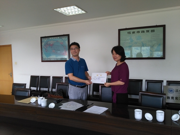 2016年9月21日下午2点,400全讯白菜网夏雨禾副院长、学科教学(语文)硕士点负责人陈柳老师、硕士生导师赖学军老师,带领全讯白菜网论坛官网学科教学(语文)教育硕士专业的两位研究生来到瑞安中学,参加全讯白菜网论坛官网教育实践基地授牌和实习计划启动仪式,开始为时一个学期的教育教学实习。