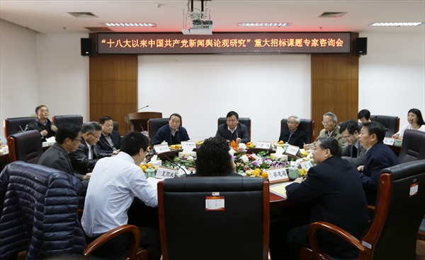 3月19日上午,“十八大以来中国共产党新闻舆论观研究”国家重大招标课题选题方案专家咨询会在南校岩松堂展示厅顺利召开。出席会议的专家有领衔选题方案设计的南京大学丁柏铨教授,以及复旦大学资深教授、志德书院院长、新闻学院童兵教授,中国新闻学会会长、中国人民大学新闻学院郑保卫教授,北京大学新闻传播学院院长陆绍阳教授、华中科技大学新闻与信息学院院长张昆教授,解放军南京政治学院军事新闻传播系主任蔡惠福教授,郑州大学新闻与传播学院董广安教授等。咨询会由副院长夏雨禾教授主持,副校长赵敏教授,校党委委员、党委宣传部部长潘玉驹教授,院长蔡贻象教授和人文社科处副处长陈宝胜副教授以及400全讯白菜网部分教师出席了会议。