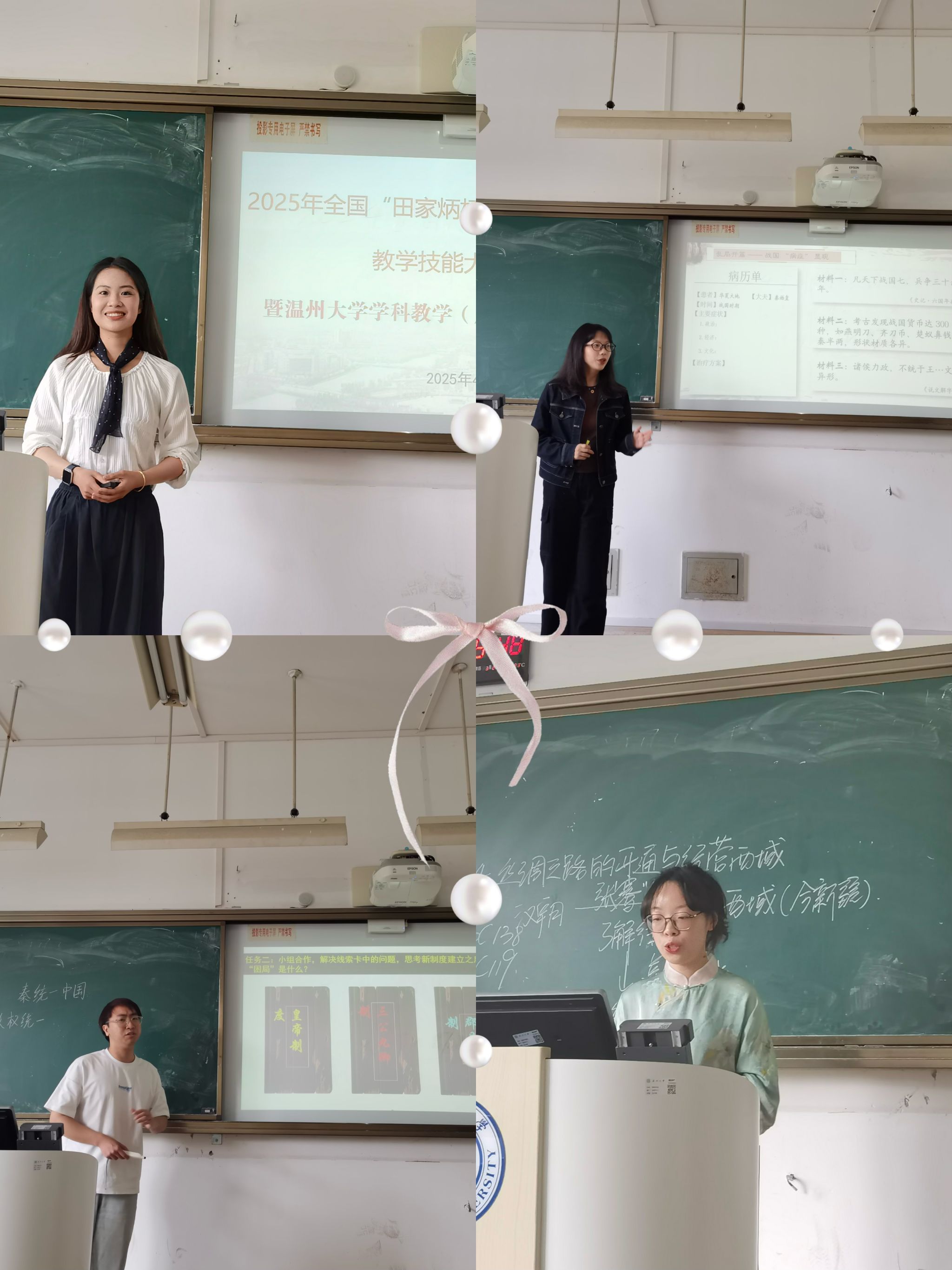 为进一步提升研究生的教学能力、强化课堂教学基本功,提升研究生的实践能力和创新能力,并为即将举行的“田家炳杯”全国学科教学(历史)专业研究生教学技能大赛选拔优秀选手,400全讯白菜网学科教学(历史)专业研究生教学技能竞赛于2025年4月18日在人文楼206教室成功举办。
