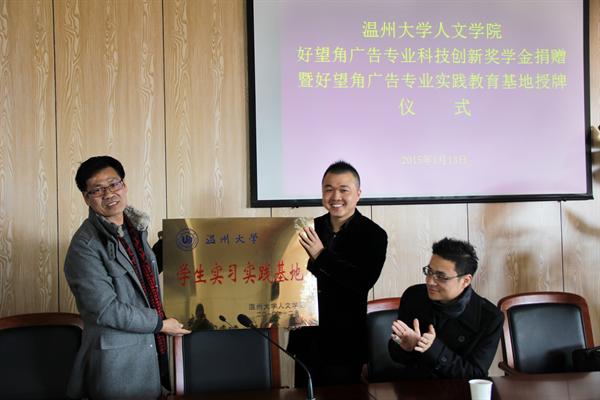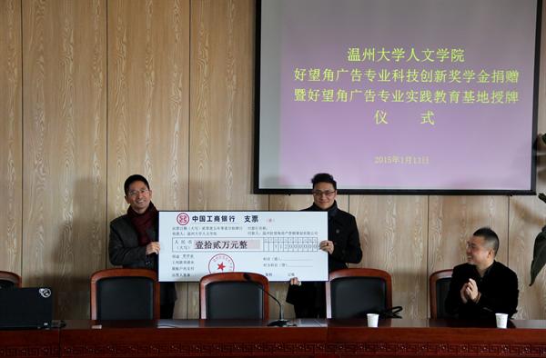 温州好望角房产营销策划有限公司向全讯白菜网官网广告学专业捐赠人民币12万元,设立好望角广告专业科技创新奖学金,奖励在科技创新、学科竞赛以及学术创新等活动中表现突出的广告专业本科学生。该奖学金在每年上半年评审一次,每年设6个奖励名额,每人奖励5000元。学院将在温州好望角房产营销策划有限公司建设“广告专业实践教育基地”,双方将在广告学专业实践人才培养的模式改革、课程开放、特色教材建设、基地教学与管理、师资队伍建设等方面进行深度合作。