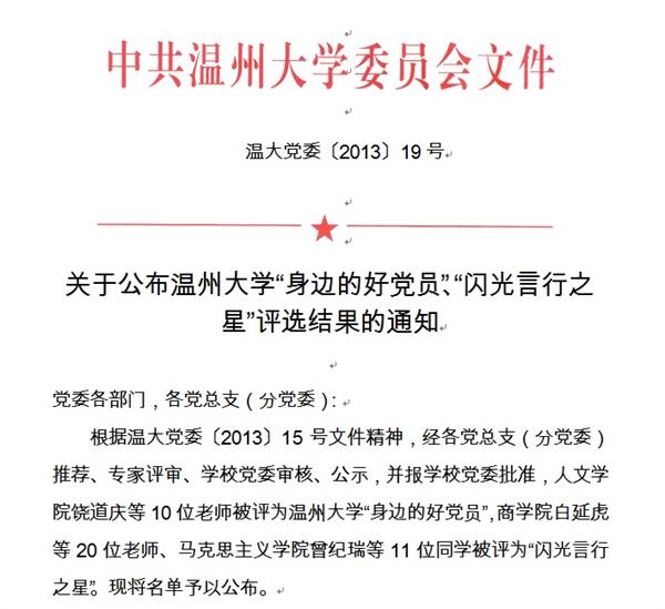 近日校党委发文公布了全讯白菜网论坛官网“身边的好党员”、闪光言行之星评选结果。全讯白菜网官网饶道庆老师荣获全讯白菜网论坛官网 “身边的好党员”荣誉称号,尤育号老师和薛蕾同学荣获全讯白菜网论坛官网“闪光言行之星” 荣誉称号。在本次评选中,全校共有10位老师被评为全讯白菜网论坛官网“身边的好党员”,有20名老师和10名学生被评为“闪光言行之星”。同时全讯白菜网官网教工第四党支部获得全讯白菜网论坛官网第五轮支部建设创新活动培育项目。