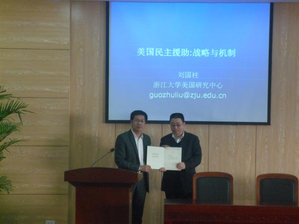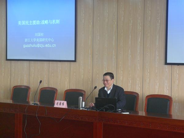 刘柱国教授从事历史学教学及科研二十余年,承担过多项国家与省部级研究课题,有关美国史研究的著述颇丰。此次讲座,刘教授深入浅出地讲述了美国民主援助的内涵和实质,阐释了民主援助产生的渊源和流变。之后刘教授图文并茂地介绍了美国民主援助的机构概况,理论联系实际,紧扣时政热点。刘教授的讲述使我们对美国民主援助有了更为全面和深刻的认识,提升了我们对当前国际政治形势问题的认知,开阔了眼界。最后师生向刘教授提问,形成良好的互动。