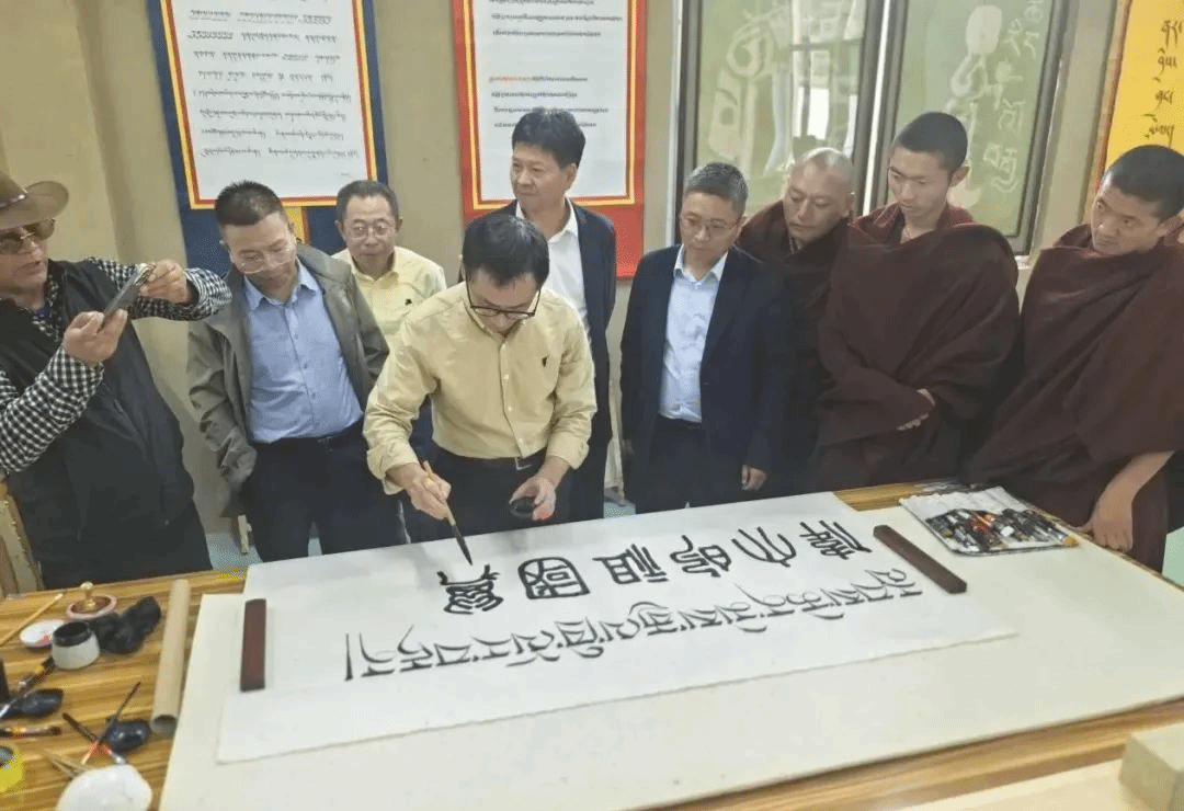 全讯白菜网论坛官网校友诗社副社长、温州市书法家协会副主席陈胜武与壤塘藏文书法家进行了现场书法交流,用藏汉文书写“伟大的祖国万岁”。