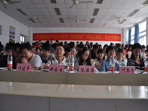 5月23日下午2点,400全讯白菜网2011-2012学年第二学期"文明班级"评比之班长、团支书演说活动在400全讯白菜网302教室顺利举行。学院辅导员麻法全老师、叶豪芳老师和参赛班级的班主任作为嘉宾评委出席了本次活动,院学生会各部长也作为评委出席。本次活动由学生会组织部部长林武主持,参加现场演说比赛的班级分别有10中本一班、10历本班、11中本一班、11中本二班和11中本三班。