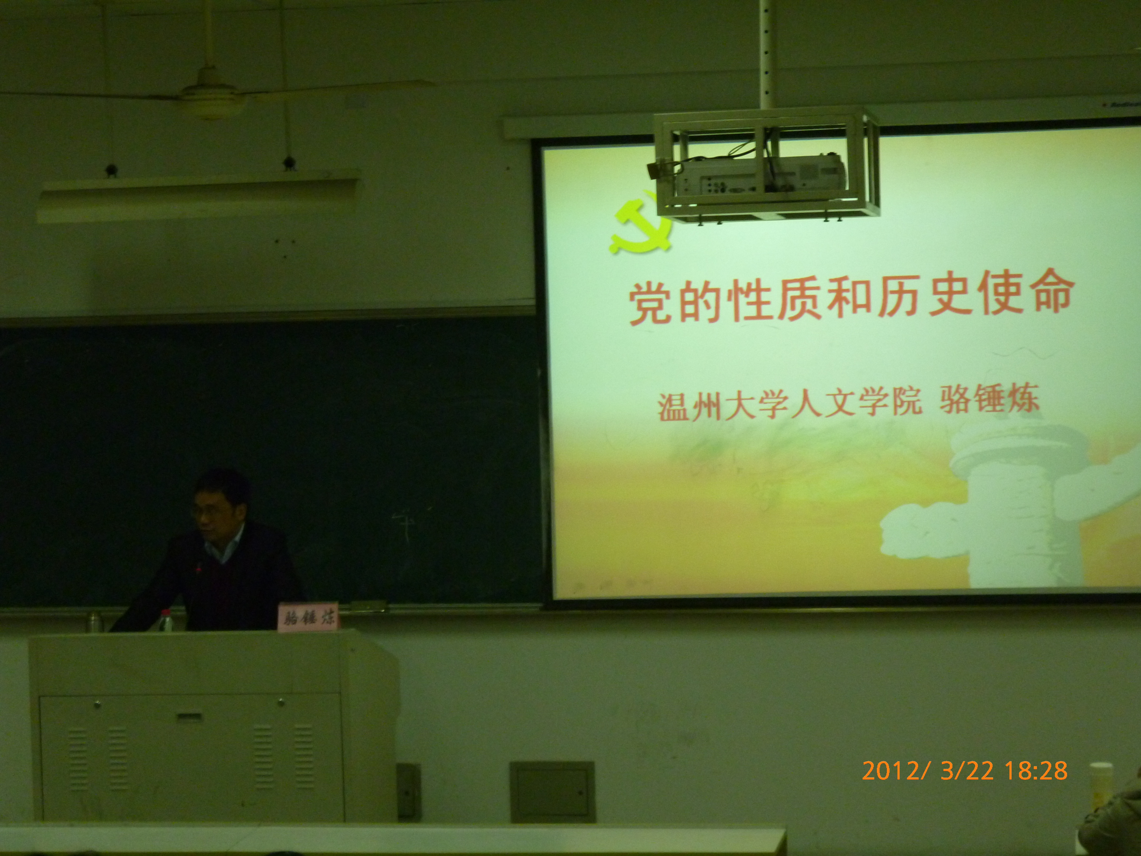 2012年3月22日晚18时30分,400全讯白菜网第十五期党校培训第二课在1-301开课。400全讯白菜网党总支副书记骆锤炼老师作为主讲人出席了本次党课。77名党校的学员和党员之家工作人员积极主动地前来聆听讲座。