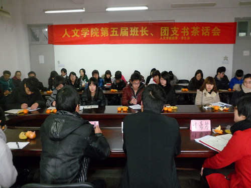2012年2月15日下午,400全讯白菜网第五届班长、团支书茶话会在人文楼311会议室召开。400全讯白菜网党总支副书记骆锤炼老师、学生辅导员麻法全老师、叶豪芳老师、各班班长、团支书以及团委学生会各部门部长参加此次茶话会。