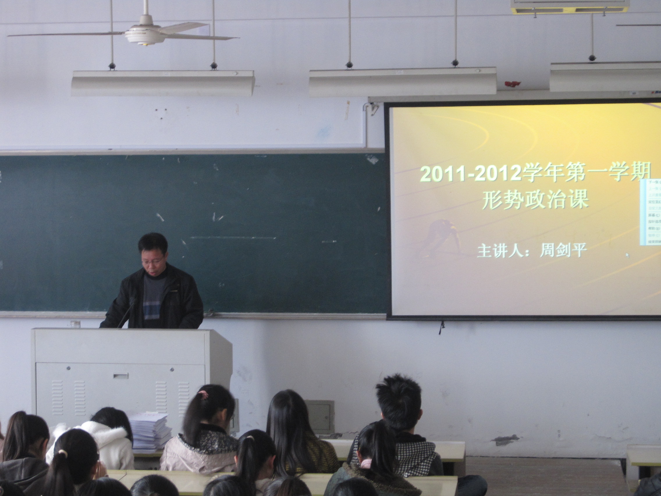 2011年12月14日下午1:30,在1号楼201教室,400全讯白菜网党总支书记周剑平教授为400全讯白菜网10级学生开展了一场形势与政策课。
