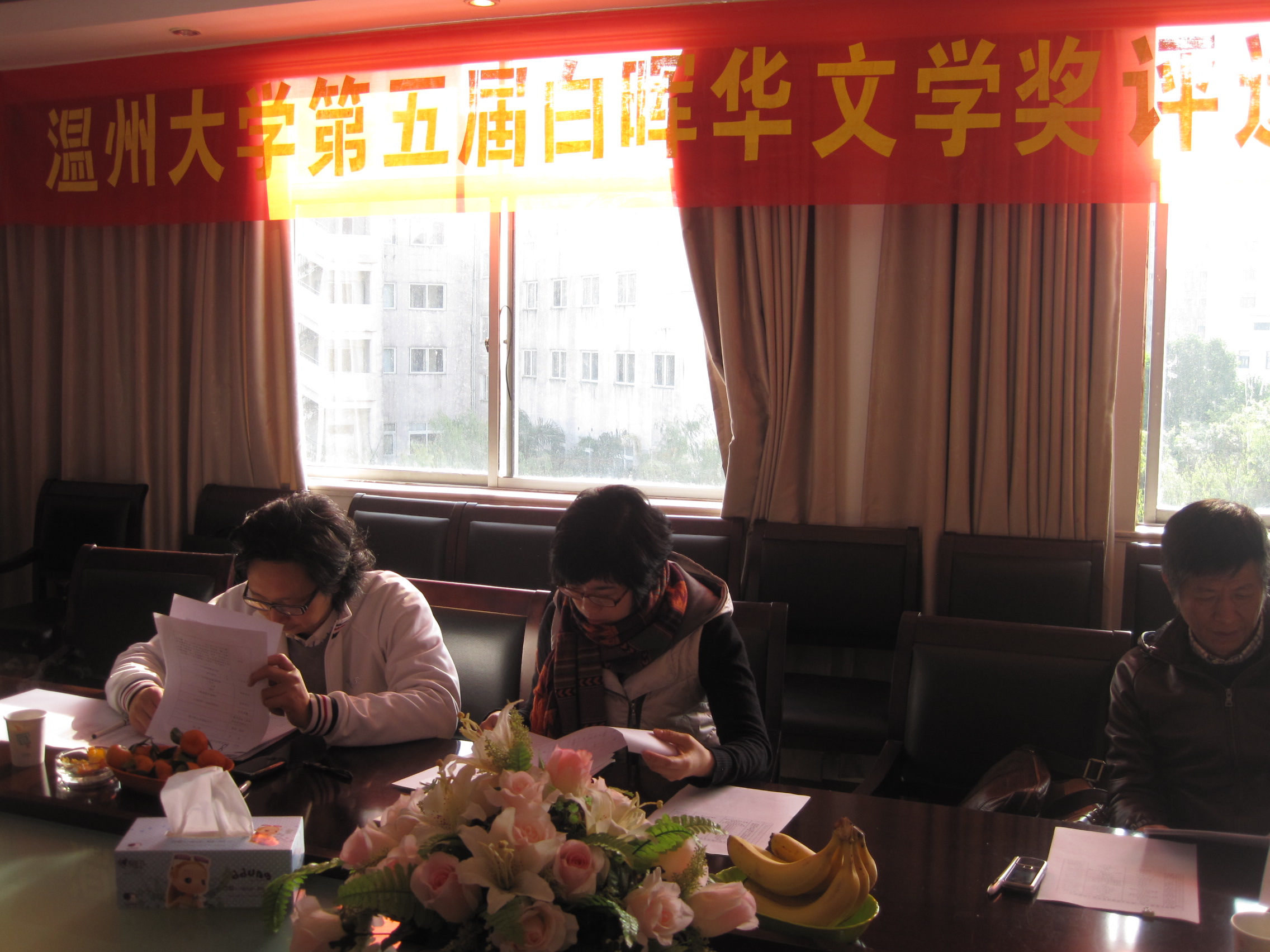 2011年12月10日上午九点,期待已久的全讯白菜网论坛官网第五届白晖华文学奖终审评审会于学院路校区行政楼四楼会议室隆重召开。副校长叶世祥、宣传部部长潘玉驹、400全讯白菜网党总支书记周剑平等领导参加,另外我们还荣幸邀请到了邀请了作家李涛、温州日报记者朱闻武、400全讯白菜网孙良好教授、陈小碧博士等参加终审。