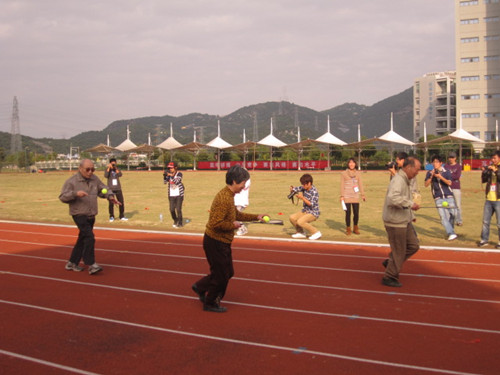 随着发令枪响,老师们手持羽毛拍,盛着一个绿色的网球如箭一般地冲了出去,你追我赶,不甘落后。其中,音乐学院的老师颇有风度,飞奔起来头发飘逸,表情泰然,再看球拍上的网球,纹丝不动。冲到终点后,他的脸上露出孩子般胜利的笑容。