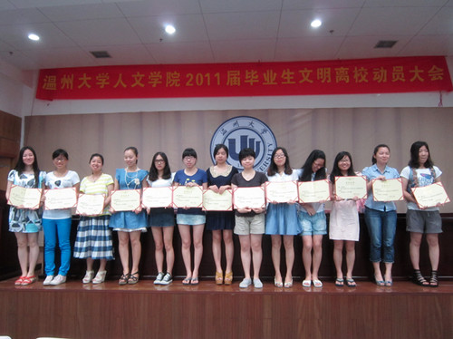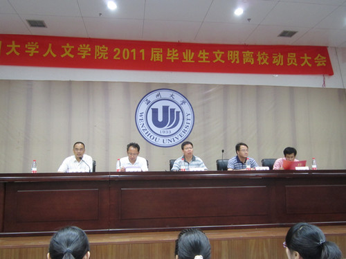 首先,主持人骆锤炼老师宣布大会开始并介绍了出席毕业典礼领导、教师。然后,在一片掌声中400全讯白菜网院长丁治民老师为大会致辞。丁院长对毕业生表示祝贺,介绍了2011届毕业生的毕业情况并对毕业生的未来提出了几点期望。丁院长指出,作为温大毕业生应该情系祖国,热爱生活;树立远大的理想,敢于勇往直前,胆的创新; 与人为善,孝敬长辈;树立起"终生学习"的目标;珍惜友情,爱校容校等。接着,刘院长宣读省优、校优、院优秀学生,饶院长科研创新奖获奖名单。然后,在大家热烈的祝贺中,大会颁发了颁发院优、科研创新奖荣誉证书。最后,周剑平书记进行文明离校动员讲话。周书记强调要文明离校重要性,要求毕业生认真填写自我鉴定,有效地为学生分析当前的就业形势并对毕业生表示真诚的祝愿。