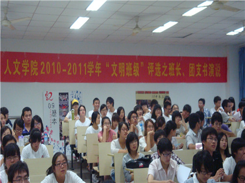 5月26日晚6点20分,在全讯白菜网论坛官网人文楼举行了400全讯白菜网2010-2011"文明班级"评选之班长团支书演说。400全讯白菜网党总支副书记骆锤炼老师、教学科杨东永老师、辅导员麻法全老师作为本次演说的评委参与了活动,而10中本1班的班主任陈源源老师和10中本2班的班主任陈伟娜老师则作为本次演说的嘉宾来到了现场。