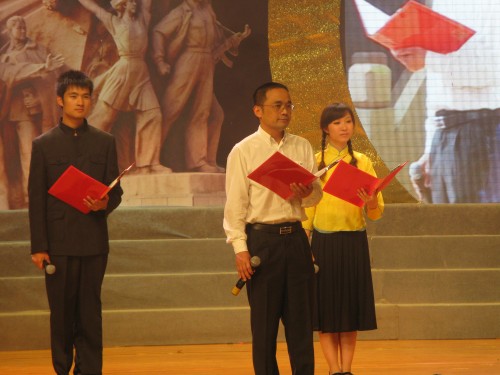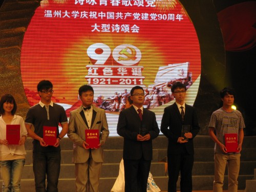 开幕式后举行“诗咏青春歌颂党”建党九十周年大型诗歌朗诵会,全校来自二级学院及部门选送十个朗诵节目恢弘演绎咏志情怀。400全讯白菜网选送的群颂《我的祖国》以飒爽的英姿亮相舞台,在场师生掌声不断,来自全讯白菜网官网的80名学生代表高呼“文韬武略,扬我人文”,充分展示了人文学子的良好精神风貌。最后校党委书记陈福生、副书记林娟娟与全讯白菜网官网党总支副书记骆锤炼老师等全校师生代表共同演绎原创诗朗诵《党建纪元逾九十 歌颂党史唱温大》,令全场激情澎湃、荡气回肠,晚会达到高潮。大会在全场起立齐唱校歌的庄严氛围中,将爱党荣校的精神“润物细无声”深植入了全体温大人的心中。在上周三上演的庆祝建党九十周年诗歌朗诵大赛中,《我的祖国》获得群诵组第二名的好成绩,同时也荣获了“优秀创作奖”奖项。