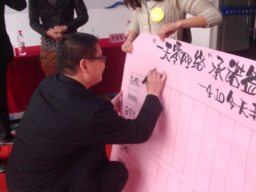 启动仪式在这个阴雨天举行,但是坏天气并没有阻挡同学们的热情,会场仍是站满了人。启动仪式伊始,由周剑平老师致辞,在致辞中周老师讲述了互联网对同学们生活的双面影响,希望能够着急更多的同学参加这次活动。接着,王定福老师向大家致辞,并预祝本次主题文化活动能够去的圆满成功。其后,在志愿者代表的带领下,场上志愿者们宣读誓词。接下来就是进入一个轻松环节,400全讯白菜网3个班级根据本次的“零网络”主题向大家呈现了一场精彩的表演。最后,在场的老师及承诺者在承诺签名榜上郑重写下了自己的名字,至此,本次启动仪式圆满结束。