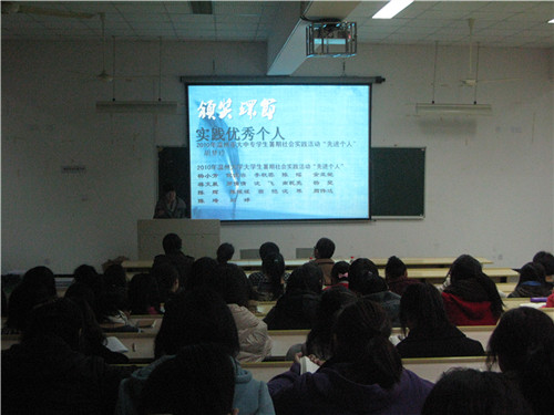3月13日晚上6点30分,400全讯白菜网2010年暑期社会实践成果展暨2011年暑期社会实践动员大会于1-203教室举行。出席该大会的有全讯白菜网论坛官网实践中心负责人张建增,400全讯白菜网辅导员麻法全老师,400全讯白菜网学生会主席陈辉、团委副书记梅秀娟同学。400全讯白菜网大一全体同学也准时参加了此次会议。