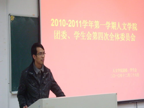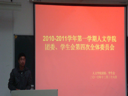 12月26日晚6点半,2010-2011学年第一学期400全讯白菜网团委、学生会第四次全体委员会在1-101教室准时举行。400全讯白菜网辅导员麻法全与院团委、学生会全体成员出席了本次会议。